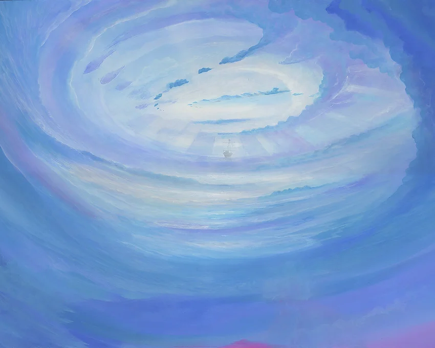 Der Himmel über dem Meer ist von dramatischen Wolken durchzogen, die in verschiedenen Formen und Schattierungen erscheinen. Ein Lichtkranz, der sich um die Spirale der Wolken windet, erzeugt einen spektakulären visuellen Effekt und unterstreicht die mystische Qualität der Szene.