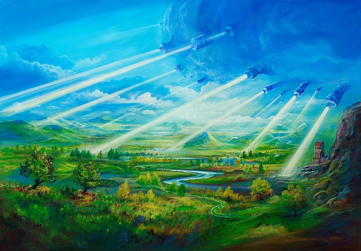 Das Gemälde offenbart eine höchst surreale Szene, in der Licht in Form von lebendigen Farbtuben mit atemberaubender Geschwindigkeit und Helligkeit hervorströmt. Diese Farbtuben sind Teil einer majestätischen Wolke am Himmel, die eine unglaubliche Energie ausstrahlt. Das aus ihr hervorquellende Licht bewegt sich mit der Geschwindigkeit des Lichts und durchbricht die Wolkendecke, als würden zahlreiche Strahler es auf die Erde lenken.