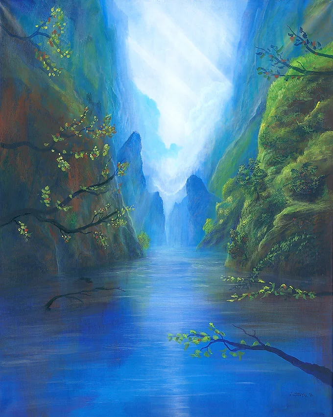 Das Gemälde enthüllt ein geheimnisvolles Tal mit Wasser als sein Hauptmotiv. In dieser Szene, in der kühles Blau und dunkles Grün vorherrschen, entsteht eine intime und naturverbundene Atmosphäre, als ob die Natur ihre Geheimnisse nicht leicht preisgeben möchte.