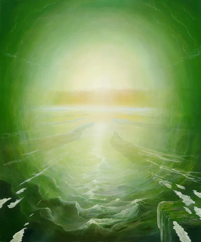 Das Gemälde bietet eine beeindruckende und geheimnisvolle Darstellung eines Szenarios, bei dem Wolken durch eine Art Tunnel oder Öffnung strömen. Diese Szene fasziniert den Betrachter mit ihrem Rätsel und der Vorstellung, dass die Wolken durch diese Öffnung eine Verwandlung erfahren.