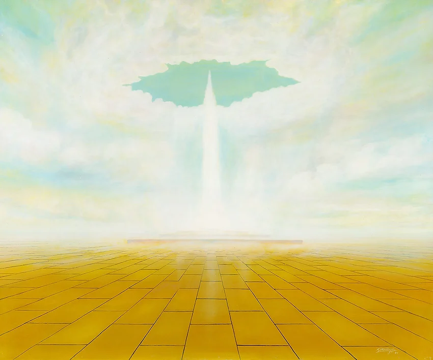 Insgesamt präsentiert dieses Gemälde eine eindrucksvolle Interpretation einer Fontäne in der Kunst. Es fängt die Kraft und Schönheit des Wassers in seiner sprudelnden Form ein und betont die Bedeutung von Architektur und Perspektive in der Kunst. Die Kombination aus Wasser, Weite und Wolken verleiht der Szene eine magische und poetische Qualität, die den Betrachter in ihren Bann zieht und zum Staunen einlädt.