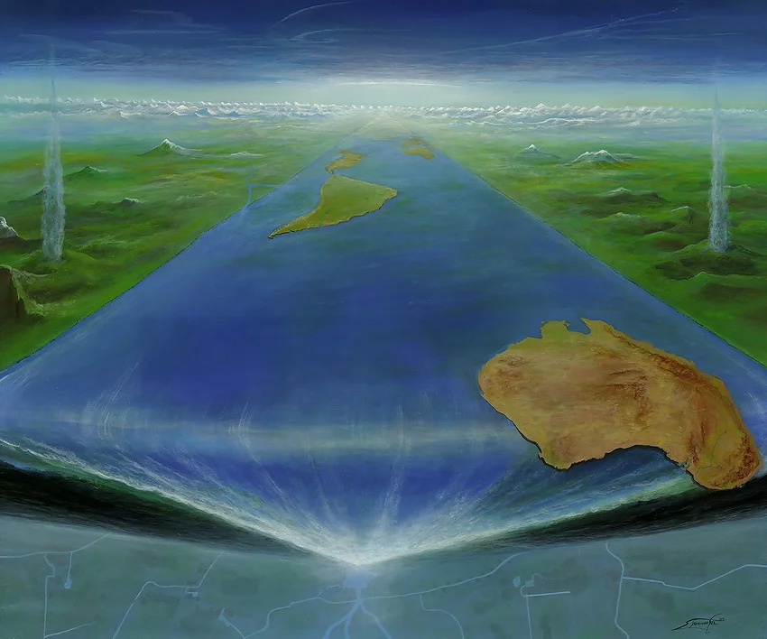 Das Kunstwerk präsentiert ein faszinierendes Gedankenspiel, bei dem ein australischer Kontinent in Form eines Wasserfalls herabstürzt. Diese surreale Darstellung fordert den Betrachter heraus, über die Natur und die Welt nachzudenken, insbesondere über die Auswirkungen des Klimawandels und des Umweltschutzes.