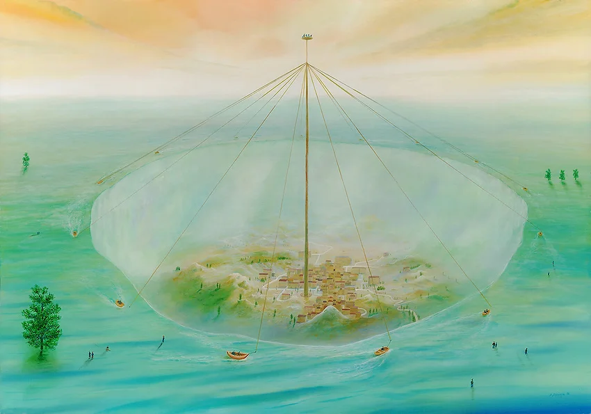 Das Gemälde zeigt eine Vision der Besiedlung des Ozeans. In der Mitte des Meeres klafft ein Loch, um das Bäume wachsen und Schiffe herum fahren. Dieses erstaunliche Unterwasserreich erstreckt sich wie ein riesiges Karussell mit einem zentralen Mast oder einer möglichen Zeltkonstruktion. In dieser vertieften Meereswelt blühen Häuser und Siedlungen auf, eine eigenständige Wasserwelt an der Luft.