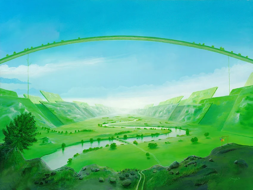 Im mittleren Bereich erstreckt sich ein breiter, sich schlängelnder blauer Fluss, umgeben von üppigem Grün und von hohen Bäumen. Doch die Besonderheit liegt in den vegetativen, organisch wirkenden Platten, die links und rechts wie künstliche Flächen abgestellt wurden, aber von natürlichen Bewuchs bewachsen sind. Diese Kombination von Künstlichem und Natürlichem verleiht dem Gemälde eine surreale Atmosphäre.