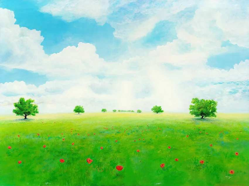 Das sommerliche Gemälde präsentiert eine idyllische Szene, die die Schönheit der Natur in den Vordergrund stellt. Die grün-blau schimmernde Landschaft erstreckt sich weit, wobei Bäume und eine üppige Wiese dominieren. Hier und da sind rote Mohnblumen als winzige, symbolische Akzente platziert.