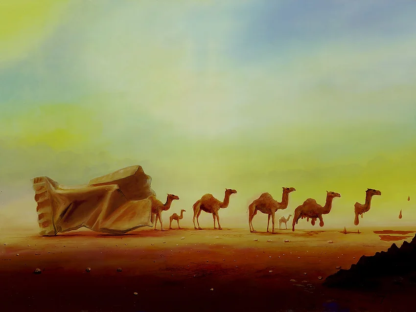 Der Titel "Karamell Karawane" enthält ein geschicktes Wortspiel, das die Begriffe "Kamel" und "Karamell" miteinander verknüpft. In dieser surrealen Szene schmelzen die Kamele buchstäblich wie Karamellbonbons. Diese Darstellung eröffnet eine tiefere Bedeutungsebene und fordert den Betrachter auf, über die Vergänglichkeit und Veränderlichkeit des Lebens nachzudenken.