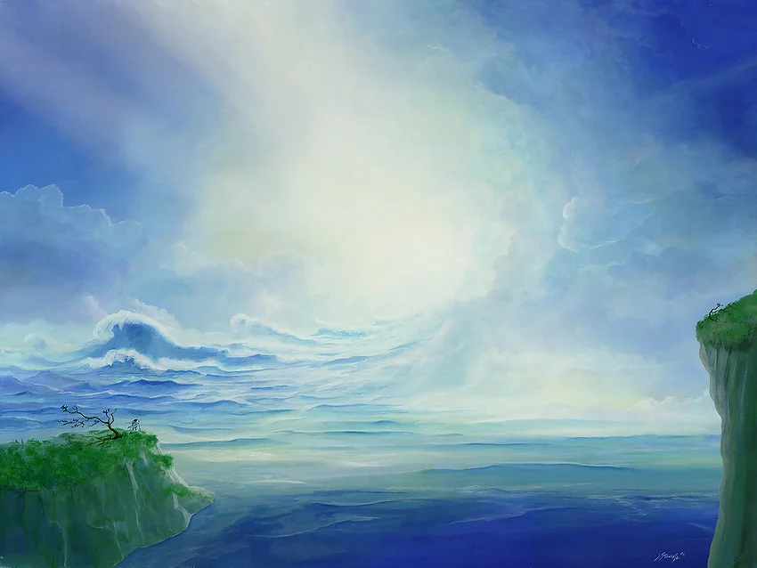 Das markantes Lichtzentrum am Horizont zieht die Aufmerksamkeit des Betrachters auf sich. Die Wolkenöffnung über diesem Lichtzentrum ermöglicht den Durchgang von strahlenden Lichtstrahlen, zusammen mit dem genannten Wassermassen.