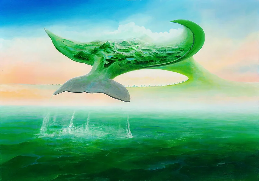 In diesem Bild ist eine fantastische Meereslandschaft zu sehen. Ein riesiger, grüner Wal fliegt oder schwebt über dem Wasser, und auf seinem Rücken befindet sich eine bewaldete Landschaft mit Hügeln. Der Wal hat einen grauen Schwanz, und unter ihm fällt Wasser zurück in das Meer. Im Hintergrund ist ein kleiner Landstreifen erkennbar.
