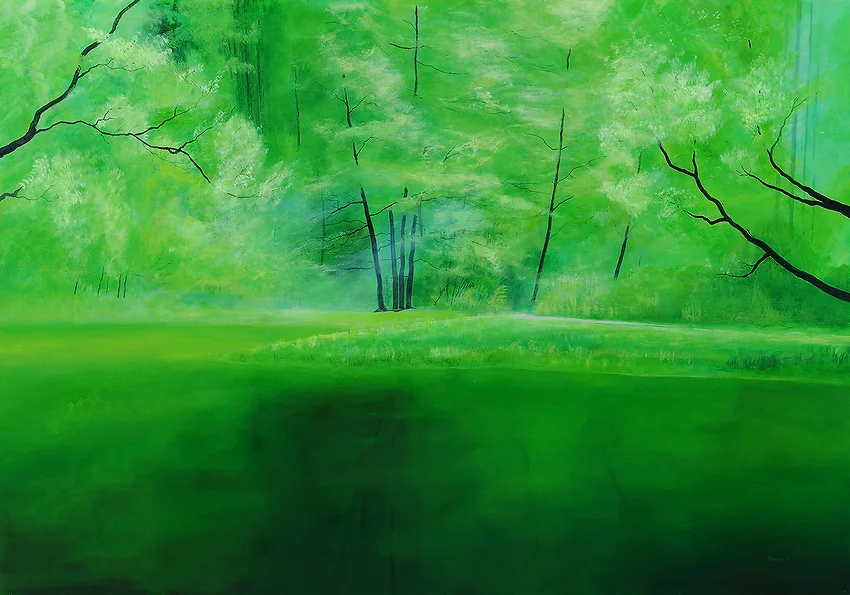 Das Gemälde "Unser Garten" präsentiert einen Laubwald in hellen, frischen Grüntönen, der sich hinter einem dunkleren See erstreckt. Die filigranen schwarzen Äste verleihen dem Bild eine zarte Struktur und eine interessante Kontrastwirkung. Das lebendige Hellgrün erinnert an den Frühling und bringt eine erfrischende Atmosphäre in das Bild.