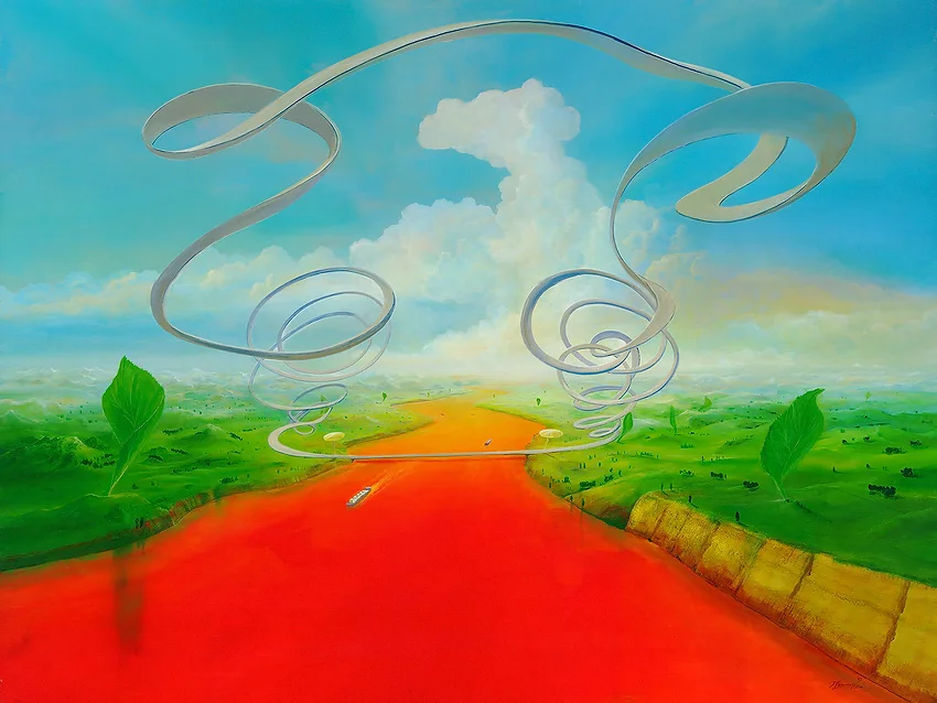 Das Gemälde, das einen roten Fluss und eine geschwungene, organisch gewachsene Brücke zeigt, eröffnet eine faszinierende Welt, die Natur und Wissenschaft auf kreative Weise verbindet. Die Verwendung der Farbe Rot in Verbindung mit Wasser schafft eine dynamische und visuell ansprechende Szene.