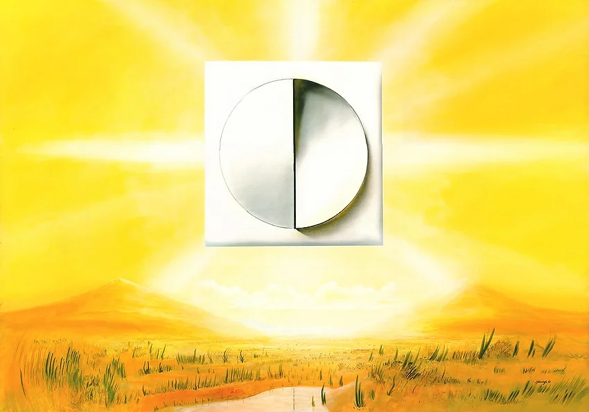 Das Licht strahlt von diesem zentralen Schalter in alle Richtungen aus, sowohl in den Himmel als auch auf die Erde. Der gelbe Himmel wird von den weißen Lichtstrahlen noch strahlender gemacht und erzeugt eine fast übernatürliche Atmosphäre. Die Erde darunter, die an eine Steppe erinnert, wird ebenfalls von diesem intensiven Licht durchdrungen und erhellt.