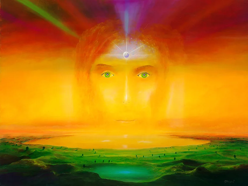 Der Himmel darüber, in einem intensiven Orange-Rot, ist das Herzstück des Bildes, weil offenbar das Gesicht mit den grünen Augen und der leuchtenden Perlkugel an der Stirn in diesen Bereich des Himmels dazu gehört. Es erzeugt eine mystische und spirituelle Atmosphäre. Dieses Bild in der Mitte des Himmels könnte als Symbol für das göttliche oder das Übernatürliche interpretiert werden, das über der natürlichen Welt thront und schon vor ihr da war und vielleicht auch jetzt unsichtbar anwesend ist und bleibt.