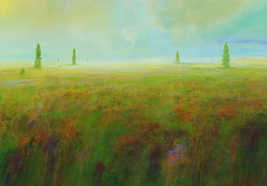 Die grüne Wiese in diesem Gemälde ist ein Aufruf zur Achtsamkeit und zur Wertschätzung des Lebens in all seinen Formen. Sie erinnert uns daran, dass unsere Entscheidungen und unser Handeln direkte Auswirkungen auf die Umwelt haben und dass es an uns liegt, die Vielfalt und den Reichtum des Lebens zu bewahren.