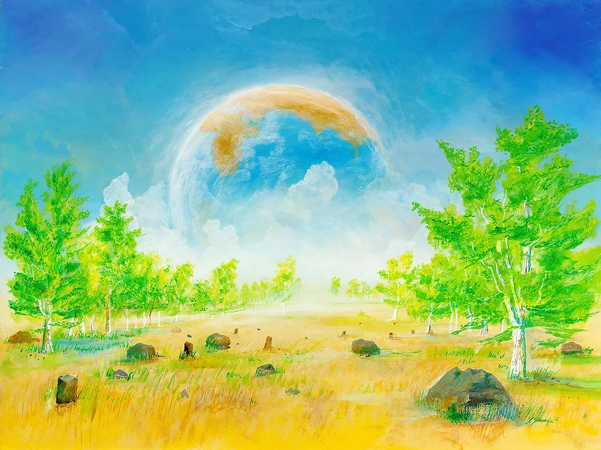 Genau wie es nur eine einzige Sonne gibt, die am Horizont sichtbar ist, vermittelt das Bild die Botschaft, dass es nur einen einzigen Planeten `Erde` gibt. Der Titel "Doppelwelt" wurde gewählt, um deutlich zu machen, dass man im Falle der Argumentation eines Ausschlußverfahrens zum Ergebnis kommt: Es existiert nur ein Planeten Erde !