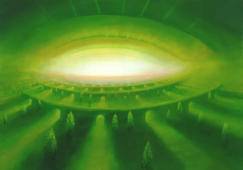 Insgesamt erzeugt das Gemälde eine mysteriöse Stimmung und regt die Vorstellungskraft des Betrachters an. Es lädt dazu ein, über die Bedeutung des trüben Lichts und des grünen Tunnels nachzudenken und sich auf eine Reise in unbekannte Dimensionen und Realitäten zu begeben.