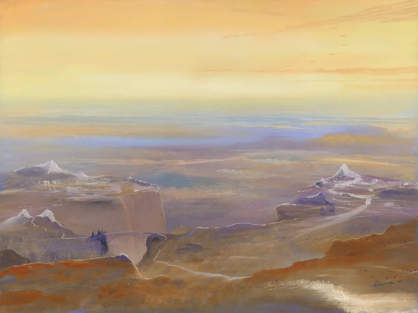 Der Blick in die Ferne führt den Betrachter in ein schier endloses Wolkenmeer, das die Vorstellungskraft beflügelt. Die Wolken erscheinen in verschiedenen Blau- und Ockertönen, und es ist schwer zu sagen, ob sie den entferntesten Bergen oder dem Himmel selbst entspringen. Diese Verschmelzung von Berg und Wolke erinnert an die Idee der Freiheit des Geistes, die keine klaren Grenzen kennt und die Fähigkeit zur Vorstellung und Entfaltung ermöglicht.