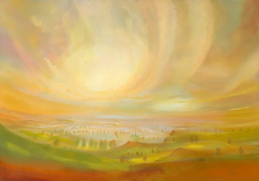 Das Gemälde lädt den Betrachter ein, in diese strahlende Welt des Geistes und der Vorstellung einzutauchen. Es ermutigt dazu, die eigene Kreativität und Spiritualität zu erkunden und sich der unendlichen Möglichkeiten bewusst zu werden, die in unserem Inneren existieren. Es ist eine Ode an die Kraft des Lichts und an die innere Schönheit, die in jedem von uns leuchtet.