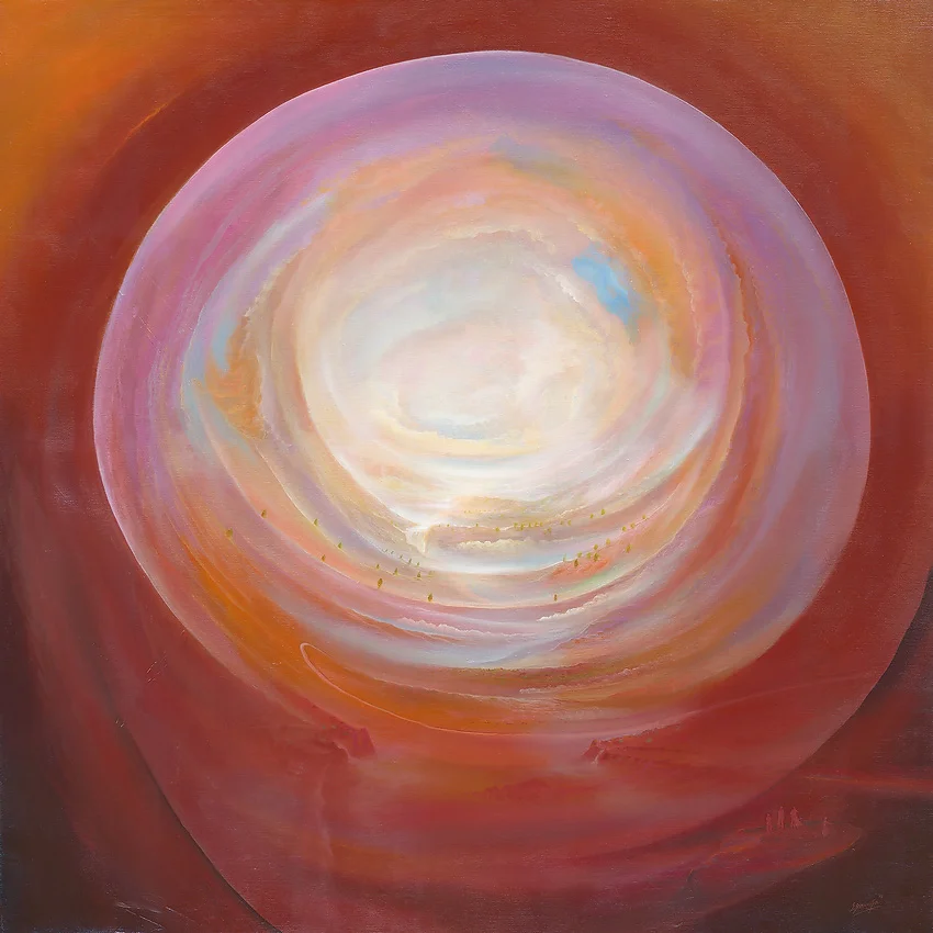 Die verschiedenen Ebenen der kreisförmigen Höhle sind in einer reichen Palette von Farben gehalten, darunter Lila, Rosa, Hellblau, Orange und vor allem dominierende Brauntöne im Vordergrund. Diese Farbenvielfalt verstärkt den Eindruck einer anderen Dimension und regt die Fantasie des Betrachters an. Das Gemälde lädt dazu ein, unseren Geist zu öffnen und neue Impulse zu setzen, während wir uns auf eine Reise durch diese surreale und tiefgründige Landschaft begeben.