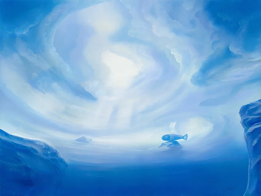 Diese Ereignisse haben die heutige Artenvielfalt und die Ökosysteme der Erde maßgeblich beeinflusst. Das Gemälde des Fisches auf der Insel erinnert uns an die erstaunliche Vielfalt des Lebens und die ständige Anpassungsfähigkeit der Natur im Laufe der Evolution. Es lädt den Betrachter dazu ein, über die Wunder der Natur und die Geschichte des Lebens auf unserem Planeten nachzudenken.