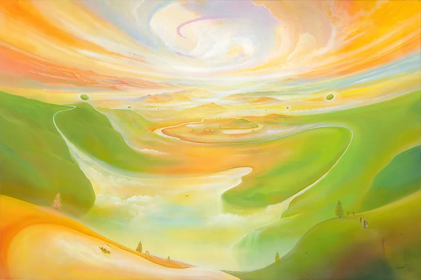 So gibt es die scheinbar schwebenden Steine oder Felsblöcke, die der Szene eine zusätzliche surreale Note verleihen. Wasser sieht wie ein plasmatischer Klecks aus und lässt Wolken darin schweben. Am unteren Bildrand stehen einzelne Menschen in größeren Abständen zueinander, und auf der linken Seite fasziniert ein Floß, das auf dem orangefarbenen Fluss gleitet, den Betrachter.