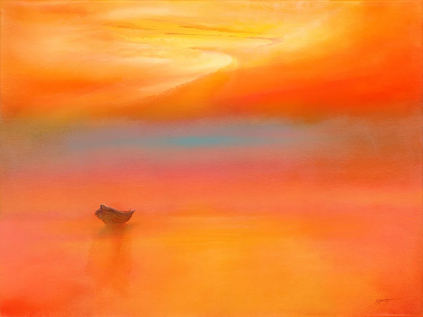 Die dominierende Farbe Orange in der Szene mit dem einsamen Boot verleiht dem Gemälde eine warme und einladende Atmosphäre. Orange wird oft mit Emotionen wie Freude, Begeisterung und Leidenschaft in Verbindung gebracht. In diesem Kontext könnte die orange Farbgebung die Abendstimmung am Meer symbolisieren und die Freude des Augenblicks betonen.