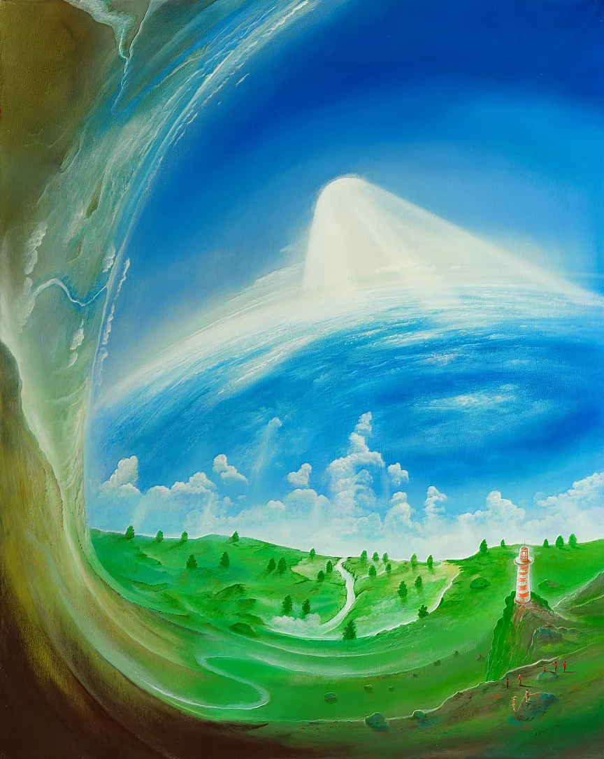 Das surreale Ölgemälde gewährt uns einen faszinierenden Blick auf die Erde aus einer überirdischen Perspektive. Es erweckt den Eindruck, als säßen wir im Weltraum auf einem erhabenen Plateau und blickten von dort aus auf unsere Heimat, die Erde. Die Szene ist gleichzeitig surreal und beeindruckend.