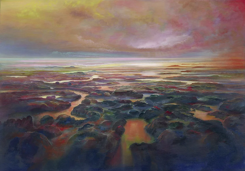 Ein Teiche, ein Wattenmeer oder Tümpel im Vordergrund des Bildes spiegeln die Farben des Himmels und der umgebenden Wolken wider, wodurch das Motiv in seiner mutmaßlichen Aussage beziehungsweise in seiner Farbigkeit auf der steinernen Erde verstärkt wird. Die besonderen Felsen rufen uns dazu auf, die Schönheit und Vielfalt der Natur zu schätzen und zu schützen.