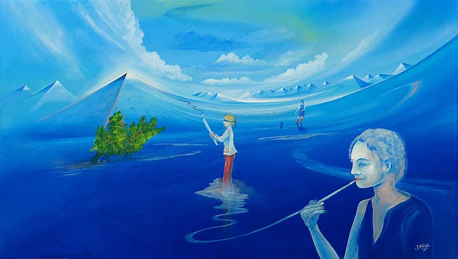 Das surreale Ölgemälde präsentiert dem Betrachter eine unkonventionelle und faszinierende Szenerie, die von rätselhaften Elementen durchdrungen ist. Im rechten Bereich des Bildes fokussiert sich die Aufmerksamkeit auf eine Frau mit kurzem Haar, die ihre Lippen mit einem Pinsel bemalt, der aus einem Bach zu entspringen scheint. Diese eigenartige Darstellung wirft Fragen nach der Bedeutung und der Beziehung zwischen Kunst und Natur auf.