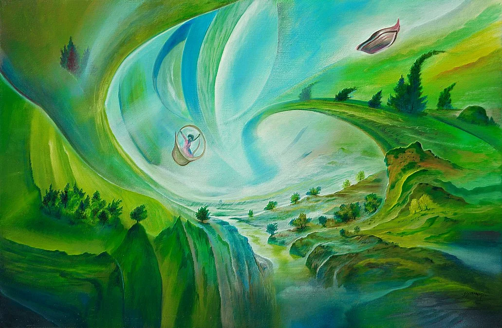 Zusammenfassend ist dieses surreale Ölgemälde eine meisterhafte Darstellung einer Welt, in der die Gesetze der Realität außer Kraft gesetzt sind. Es regt die Vorstellungskraft an, lädt zur Reflexion ein und stellt die Konventionen in Frage. Es fordert den Betrachter heraus, die Grenzen der Wahrnehmung und des Verständnisses zu erweitern und in eine faszinierende Welt einzutauchen, in der alles möglich zu sein scheint.