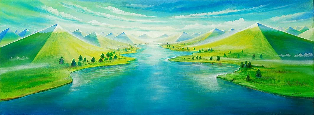 Diese Ölgemälde präsentiert eine eindrucksvolle Landschaftsszene, die von einer Vielzahl auffälliger Elemente geprägt ist. Das dominierende Merkmal ist der breite Fluss, der die Komposition in der Mitte teilt und zusammenhält. Die Ufer des Flusses erstrecken sich sanft nach links und rechts, wodurch eine harmonische Symmetrie entsteht.