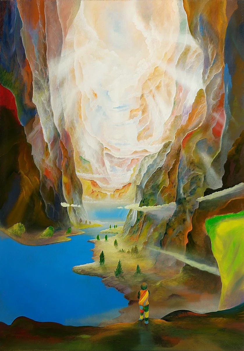 Im Vordergrund ragt eine Figur auf einem markanten Felsvorsprung heraus. Diese Figur trägt eine auffällige Patchwork-Kleidung und scheint eine tiefgehende Verbindung zur gemalten Welt um sich herum zu haben. Ihre Präsenz verleiht dem Bild eine surreale Dimension, in der Realität und Fantasie verschmelzen.