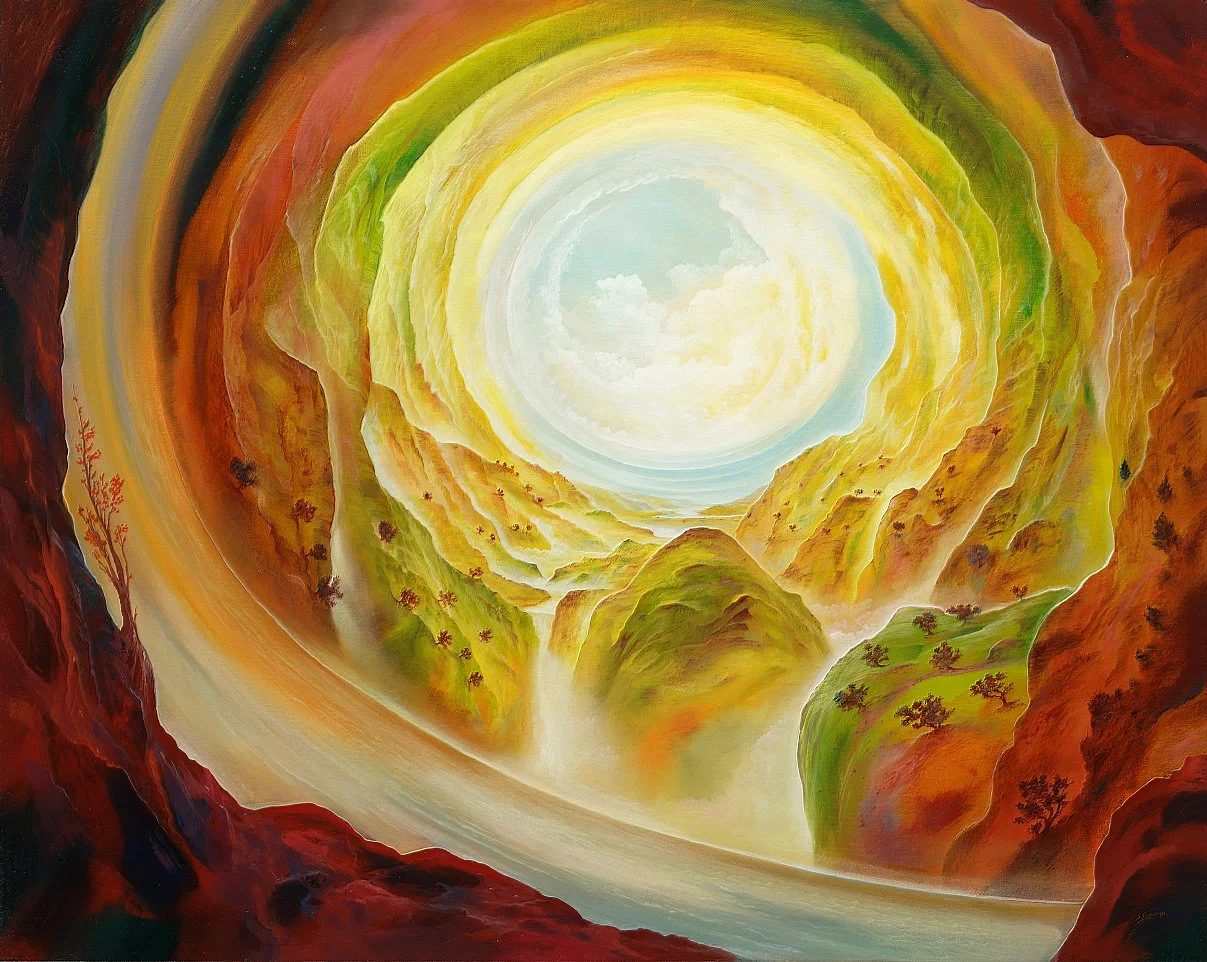 Dieses kunstvolle Gemälde eröffnet eine Tür zur unbekannten Tiefe einer Psyche oder Seele und scheint dabei strahlend und lebendig zu sein. Es ist geprägt von hellen Wasserfällen, die das Bild mit ihrem erfrischenden Glanz durchfluten. Ein markantes Merkmal dieses Kunstwerks sind die runden, fast kreisrunden Wasserflächen, die der Künstler geschaffen hat, und die erhabene Lichtgebung, die dem Bild eine besondere Atmosphäre verleiht.