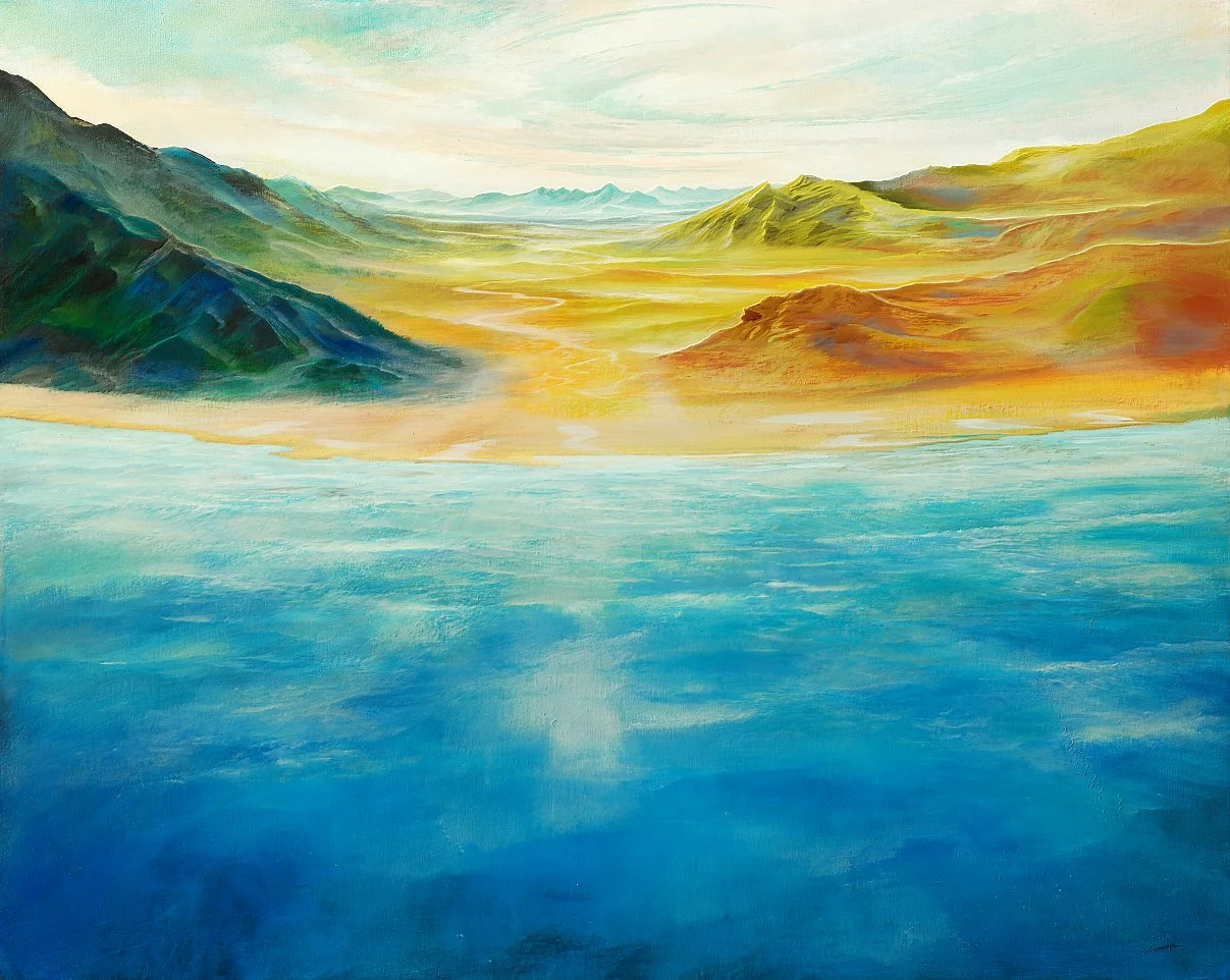 Insgesamt drückt dieses Gemälde das Gefühl von Erhabenheit, Weite und innerem Frieden aus. Der Horizont spielt eine zentrale Rolle dabei, die räumliche Dimension und den Betrachter in die Tiefe der Landschaft zu ziehen. Es erinnert den Betrachter daran, die Schönheit und Größe der Natur zu schätzen und die unendlichen Möglichkeiten der Entdeckung in der Welt um uns herum zu erkunden.