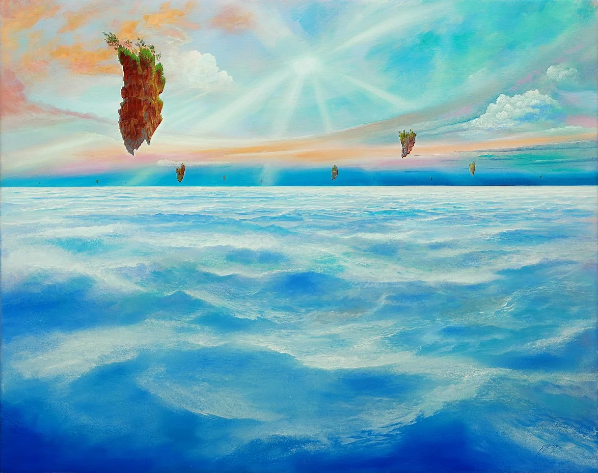 Überraschenderweise befindet sich in der Luft über dem Meer eine Szene mit fliegenden Inseln, die vom Wind getrieben werden. Diese schwebenden Inseln wirken surreal und vermitteln den Eindruck einer Welt im Wandel. Sie könnten als Symbol für die Suche nach neuen Lebensräumen oder als Ausdruck des menschlichen Überlebenswillens gedeutet werden.
