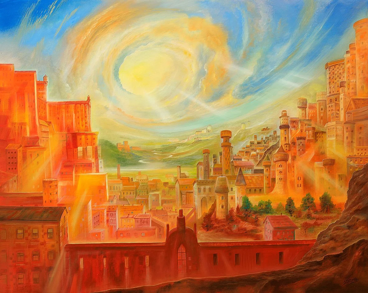Insgesamt drückt dieses Gemälde die Idee aus, dass Städte und ihre Bewohner eine wichtige Symbiose bilden, bei der Stabilität und Kontinuität in Harmonie mit der dynamischen Energie des Lebens stehen. Es erinnert uns daran, die Schönheit und Widerstandsfähigkeit unserer städtischen Umgebungen zu schätzen.