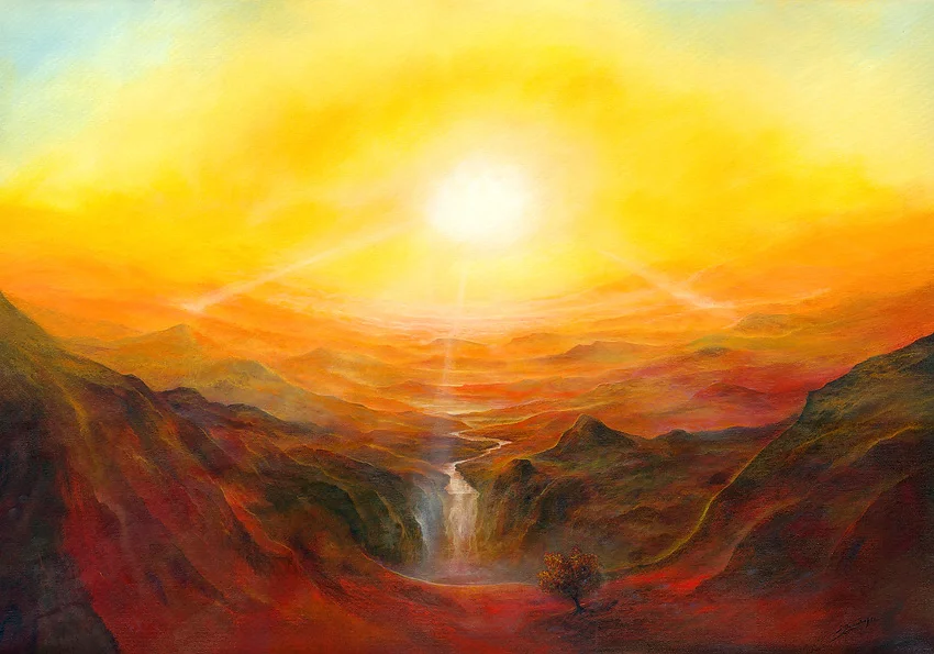 Dieses Gemälde ist eine Lobpreisung der Sonne und all dessen, wofür sie steht. Die strahlende Sonne im Zentrum des Bildes ist nicht bloß eine Lichtquelle; sie verkörpert eine Quelle göttlicher Energie und Erleuchtung. Ihr Glanz durchdringt das Dunkel und zieht die Blicke verirrter Geister und Menschen auf sich.a