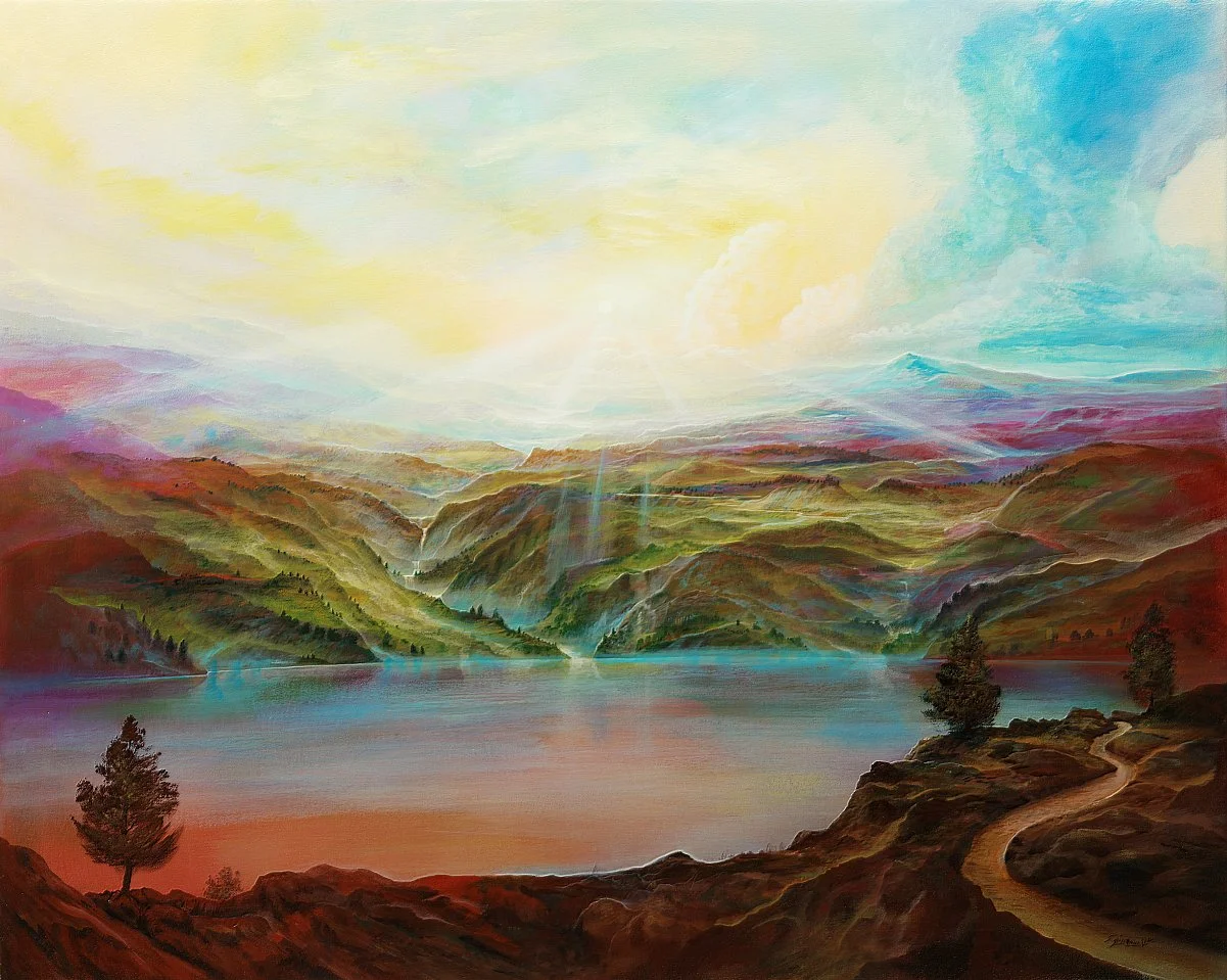 Insgesamt lädt dieses Gemälde den Betrachter dazu ein, in die bezaubernde Welt der Natur einzutauchen, die von lebendigen Farben, einer harmonischen Spiegelung und der Verheißung des Unbekannten geprägt ist. Es erinnert daran, wie die Kunst die Schönheit der Natur einfangen und in eine Quelle der Inspiration und Entdeckung verwandeln kann.