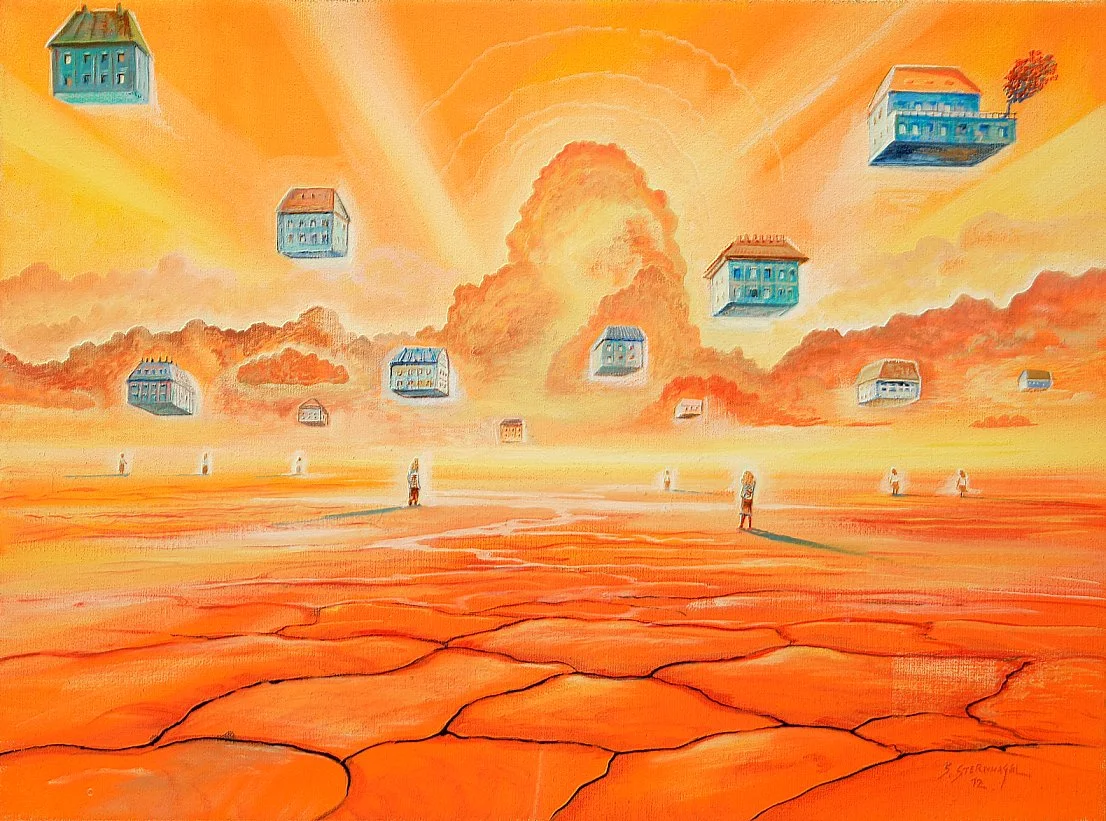 Das vorliegende Gemälde präsentiert eine beeindruckende Darstellung von fliegenden Häusern, die gleichzeitig auf die moderne Urbanisierung hinweisen. Diese surreale Szene vermittelt den Eindruck, dass die Städte immer dichter und überfüllter werden, und die Menschen versuchen, dem wachsenden Druck zu entkommen, indem sie ihre Häuser in den Himmel erheben.
