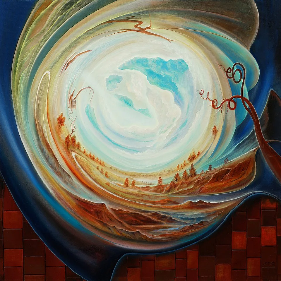 Im Vordergrund des Gemäldes präsentiert sich ein rotbrauner Fliesenspiegel mit einem geometrischen Muster. Dieser Bereich kontrastiert auf faszinierende Weise mit den organischen Formen der Natur und der Spirale. Das geometrische Muster könnte auf die Ordnung und Struktur im Universum hinweisen.
