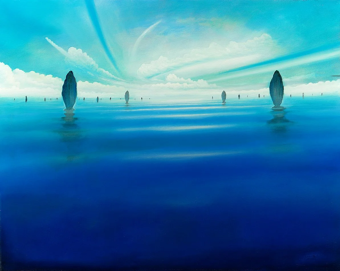 Die markantesten Elemente des Gemäldes sind jedoch die baumartigen Inseln, die aus dem Meer aufragen wie steinerne Bäume. Diese erheben sich majestätisch aus dem Wasser und verleihen der Szene eine beinahe mystische Qualität. Die Kombination aus den sanften Wellen, der lebendigen Wasserfläche und den skurril geformten Inseln schafft eine einzigartige und faszinierende Landschaft.