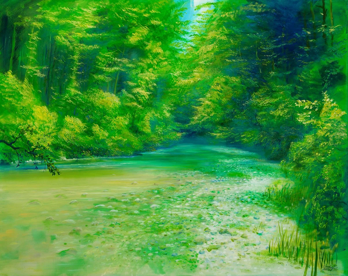 Während das obere Drittel des Bildes von dieser strahlenden Lebendigkeit geprägt ist, nimmt das Grün im unteren Teil des Gemäldes eine andere, fast geheimnisvolle Gestalt an und versteckt sich in den Schatten des Waldes. Hier enthüllt sich eine verborgene Seite der Natur, eine, die sich den neugierigen Blicken der Betrachter zu entziehen scheint.