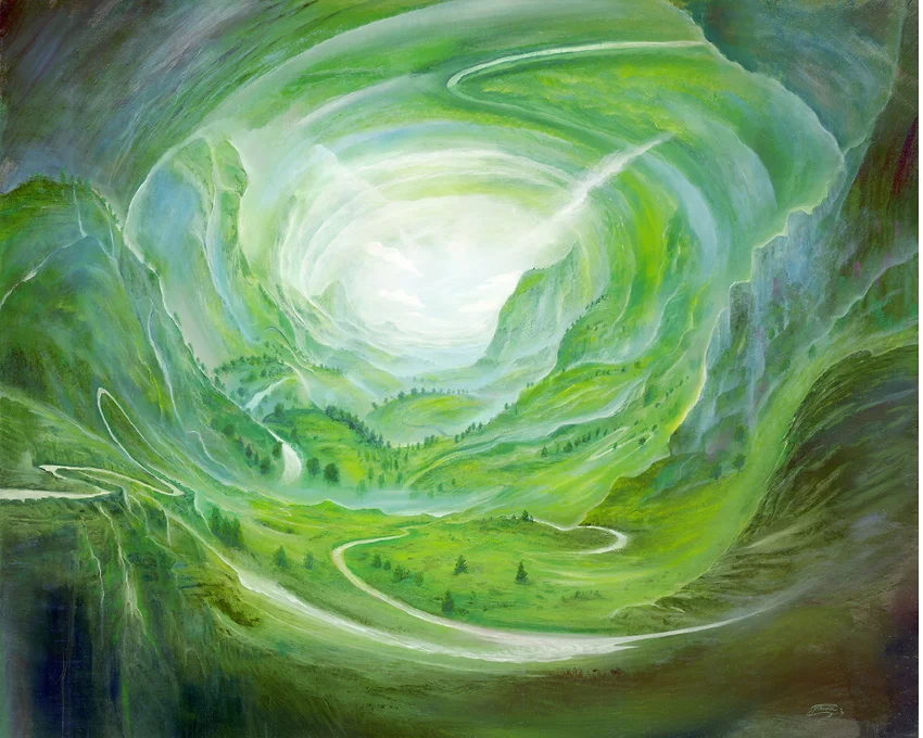 Dieses Gemälde offenbart dem Betrachter eine faszinierende Szene voller Bewegung und Energie. Im Zentrum der Darstellung erstreckt sich ein drehender Strudel, der die ständige Unruhe und die sich unaufhörlich verändernde Natur der Welt verkörpert. Diese spiralförmige Bewegung symbolisiert die Lebenskraft, die in einem fortwährenden Auf und Ab existiert und grüne Energie hervorbringt.