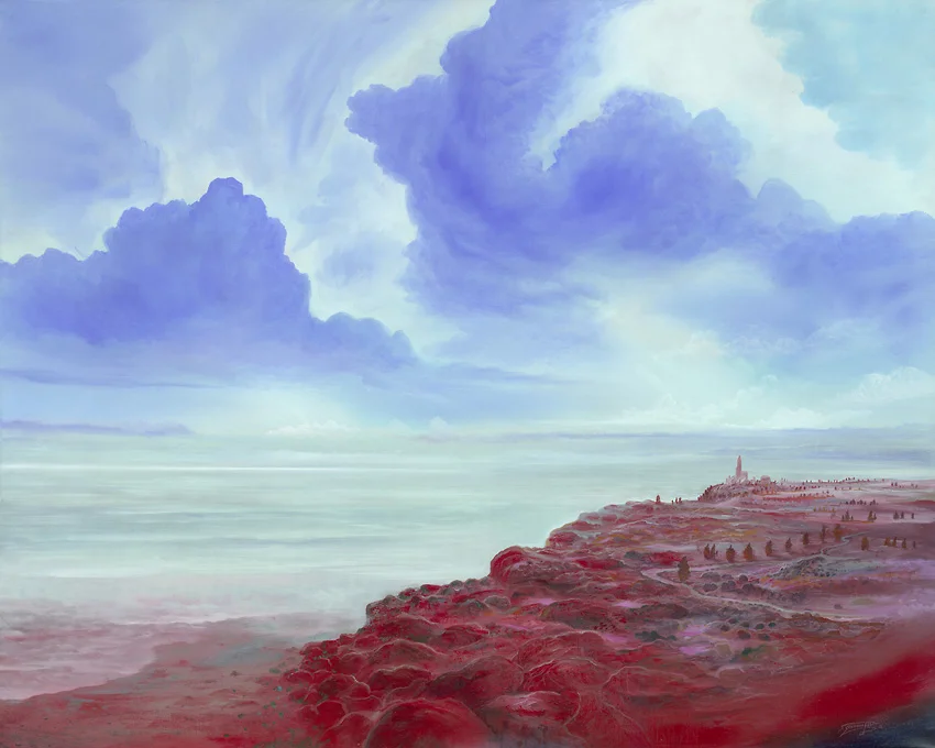 Das Gemälde offenbart eine faszinierende Landschaft, in der die Natur in all ihrer Pracht und Lebendigkeit zum Ausdruck kommt. Im Vordergrund erstreckt sich eine rötliche Erdoberfläche, die den Eindruck vermittelt, als strebte sie dem Meer entgegen. Es scheint, als ob die Erde selbst eine Sehnsucht verspürt, sich dem umgebenden Ozean hinzugeben.