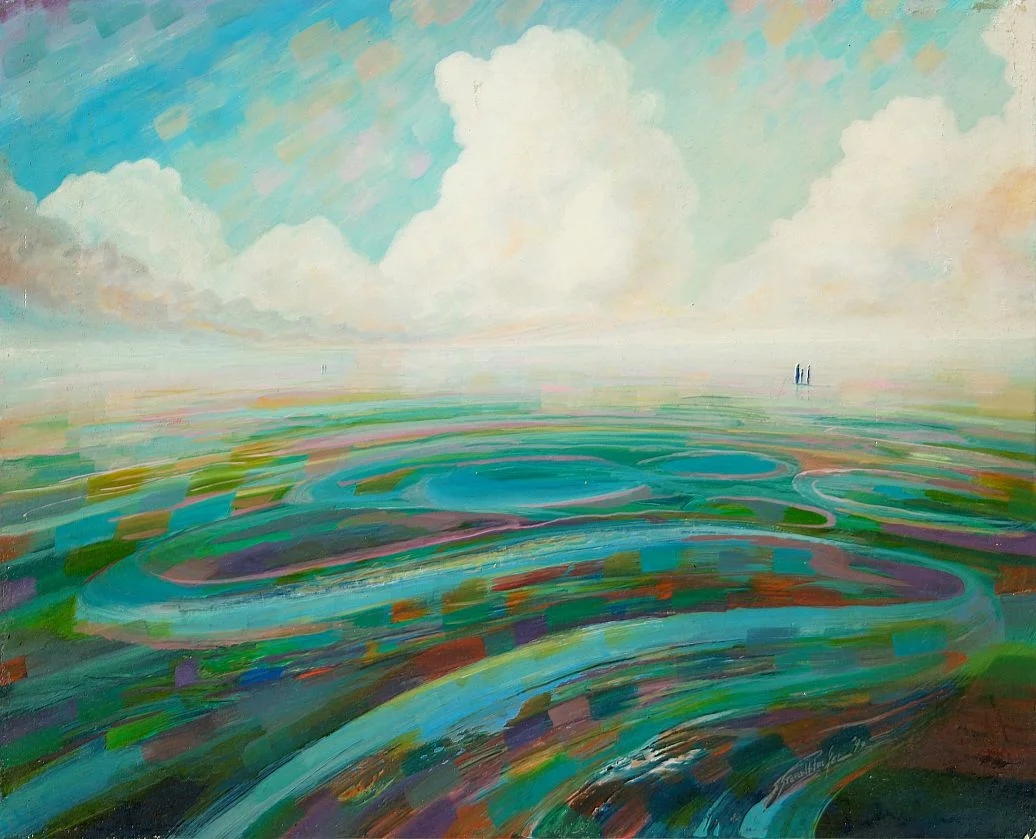 Dieses Kunstwerk präsentiert auf eindrucksvolle Weise die bedeutende Rolle der Farbe in der Kunst, indem es eine breite Palette von Bedeutungen und Emotionen anspricht. In dieser abstrakten Darstellung verschwimmen die Grenzen zwischen Form und Farbe, wobei abstrakte Elemente wie Spaziergänger und eine flache Ebene in einem kaleidoskopartigen Farbspektrum miteinander verschmelzen.