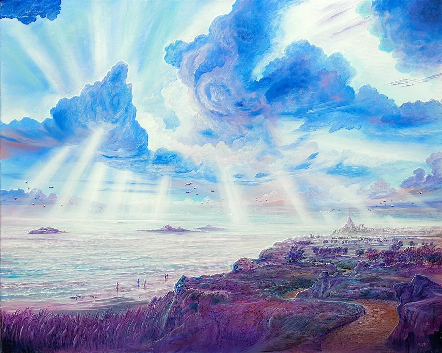 Das beeindruckende Gemälde entführt den Betrachter in eine Welt, in der die Grenzen zwischen Himmel und Erde, Natur und Menschheit verschmelzen. Der Himmel ist durchzogen von Lichtstrahlen, die die Wolken in außergewöhnlichen Formationen durchdringen und eine Atmosphäre der Magie schaffen. Es herrscht ständige Unruhe des Lichts, wobei die Wolken in verworrenen Tanz am Himmel wirbeln und eine erfrischende Brise spürbar wird.