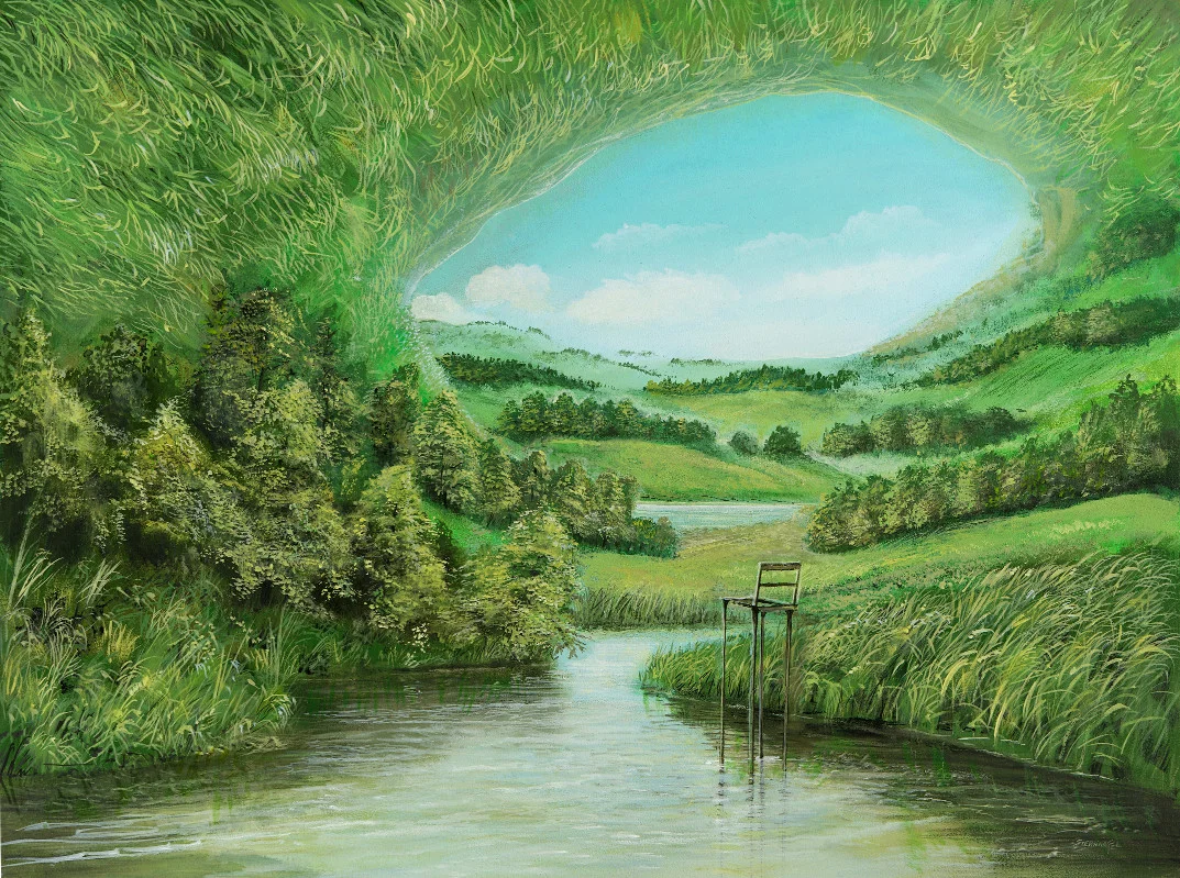 Entlang des unteren Randes zieht sich eine Hügelkette, die von üppigen Bäumen gesäumt wird. Die sanften Hügel führen den Blick bis zum Horizont, und es wird deutlich, wie viel auf diesem kleinen Format geschieht. Im Vordergrund erstreckt sich ein Gewässer, umgeben von einem wild bewachsenen Ufer in verschiedenen Grüntönen. Doch das auffälligste Element im Bild, das auch seinen Titel inspirierte, ist der Hochstuhl, der im Wasser steht. Jeder Betrachter ist eingeladen, seine eigene Interpretation zu finden oder einfach den Stuhl und seine Bedeutung wirken zu lassen.