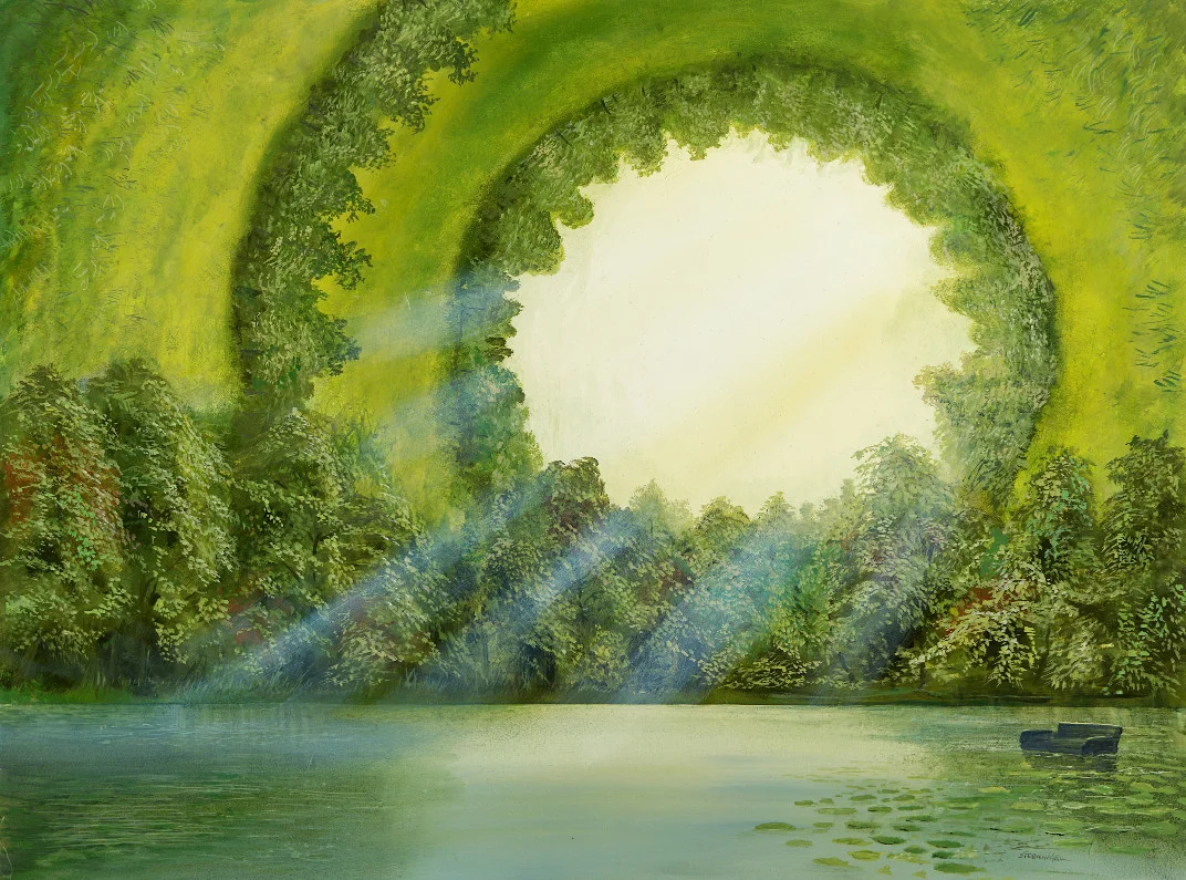 Das Sofa auf dem Gemälde, das sanft auf dem Wasser treibt, lädt den Betrachter ein, sich in Gedanken darauf niederzulassen. Stellen Sie sich vor, wie sich das gewölbte Dach dieser gemalten Höhle langsam im Uhrzeigersinn dreht, umgeben von Gräsern und Bäumen. Die Decke und die Wände bewegen sich unter dem Sofa hindurch, tauchen ins Wasser ein und erscheinen wieder an der Oberfläche, um eine weitere ruhige Drehung zu beginnen.