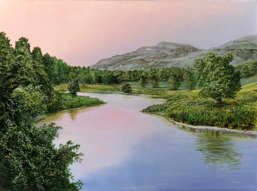 Das Bild vermittelt eine ruhige, fast meditative Atmosphäre, die den Betrachter in eine friedliche Abendstimmung eintauchen lässt. Im Vordergrund verläuft ein sanft plätschernder Fluss, dessen Wasser in weichen Wellen an die Uferbank schlägt. Der Fluss selbst spiegelt die umgebende Natur wider – die Bäume am Ufer, deren Blätter im sanften Sommerwind rascheln, und die sanften Hügel und Berge im Hintergrund. Diese Spiegelung im Wasser verstärkt den Eindruck der Harmonie und der ungestörten Koexistenz von Natur und Wasser.