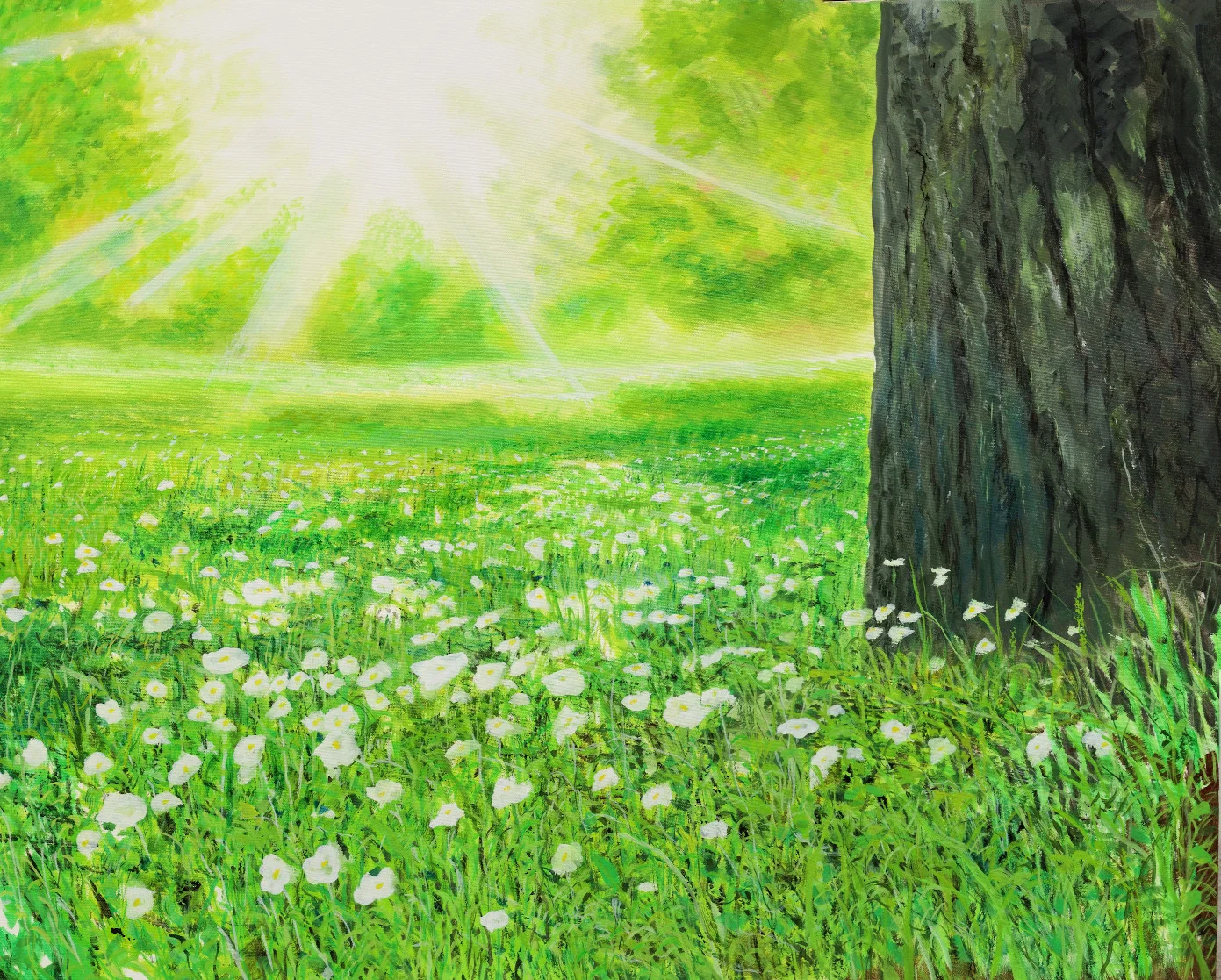 Das Gemälde zeigt eine Szene, die die Natur stark und gesund darstellt, vergleichbar mit jemandem, der frisch aus dem Fitnessstudio kommt. Licht, eine üppige Wiese mit saftigem Gras und einem starken Baumstamm im warmen Sommerlicht, vermittelt den Eindruck von Vitalität und Gesundheit. Die weißen hellen Blumenblüten in der Szene fügen eine zusätzliche Dimension der Schönheit und Frische hinzu.