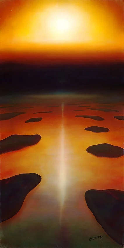 Dieses archaische Gemälde imponiert durch sein einfaches und dennoch faszinierendes Motiv. Es zieht den Betrachter in die Weite einer Szenerie, die von ihrer rätselhaften und urtümlichen Atmosphäre lebt.